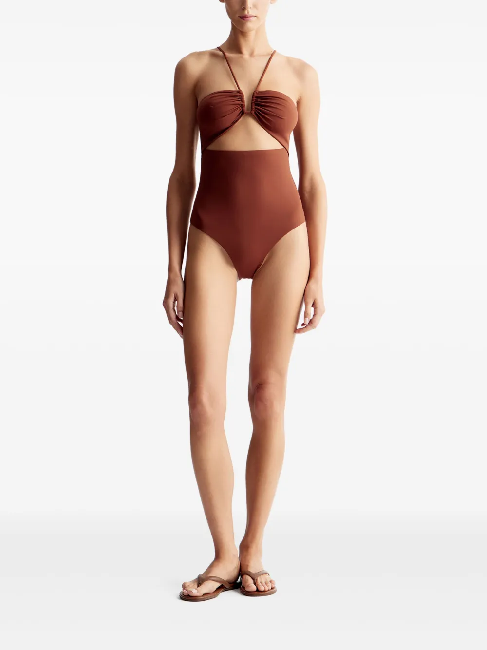 bruin ruchedetails uitgesneden details dunne bandjes Zwemkleding moet over je eigen kleding worden aangepast.