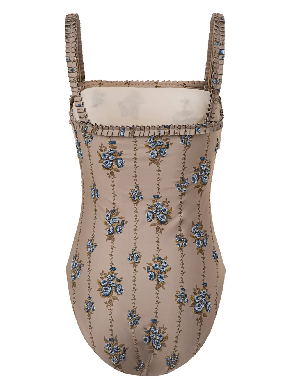 taupe gerecyclede polyesterblend stretch design instapmodel all-over bloemenprint vierkante hals ruche details dunne schouderbandjes mouwloos Zwemkleding moet over je eigen kleding worden aangepast.