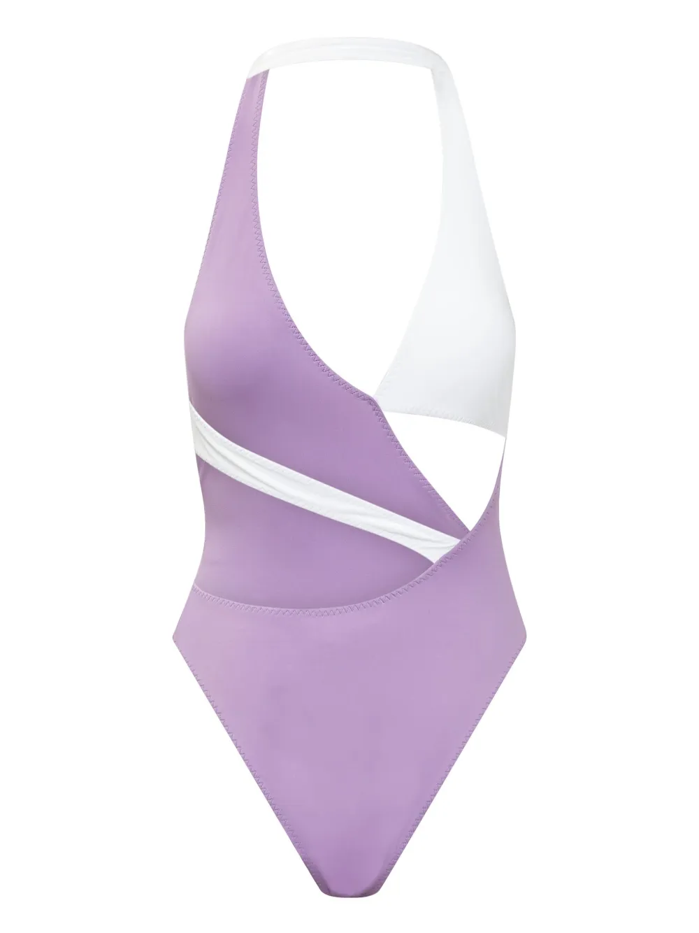 wit/lichtblauw onesie design halternek uitgesneden detail Zwemkleding moet over je eigen kleding worden aangepast.