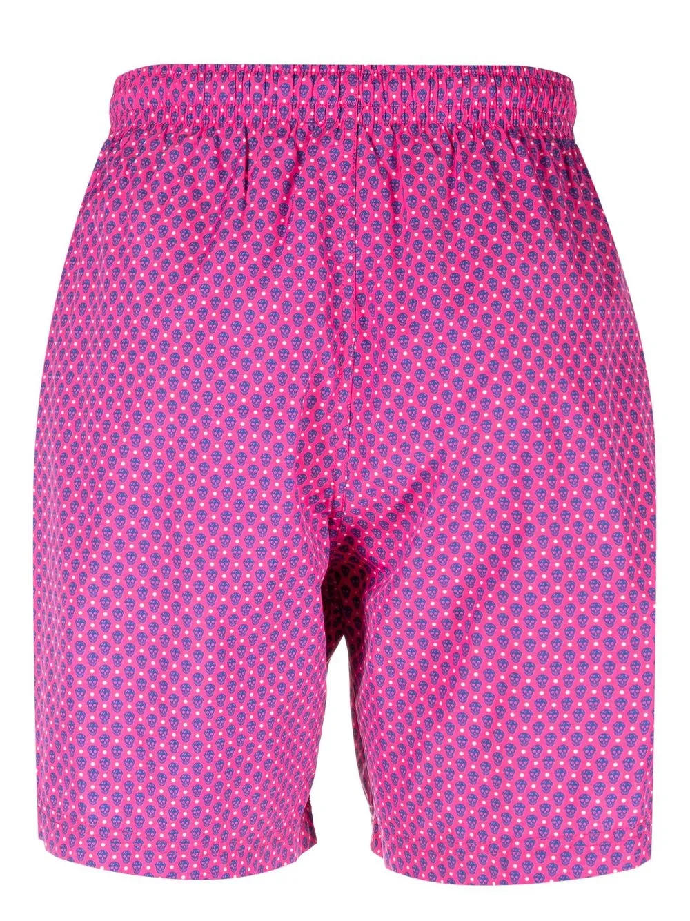 Roze, paars, doodskopprint, stippenprint, discrete stiksels, elastische tailleband en straight-fit. Zwemkleding moet over je eigen kleding worden aangepast..