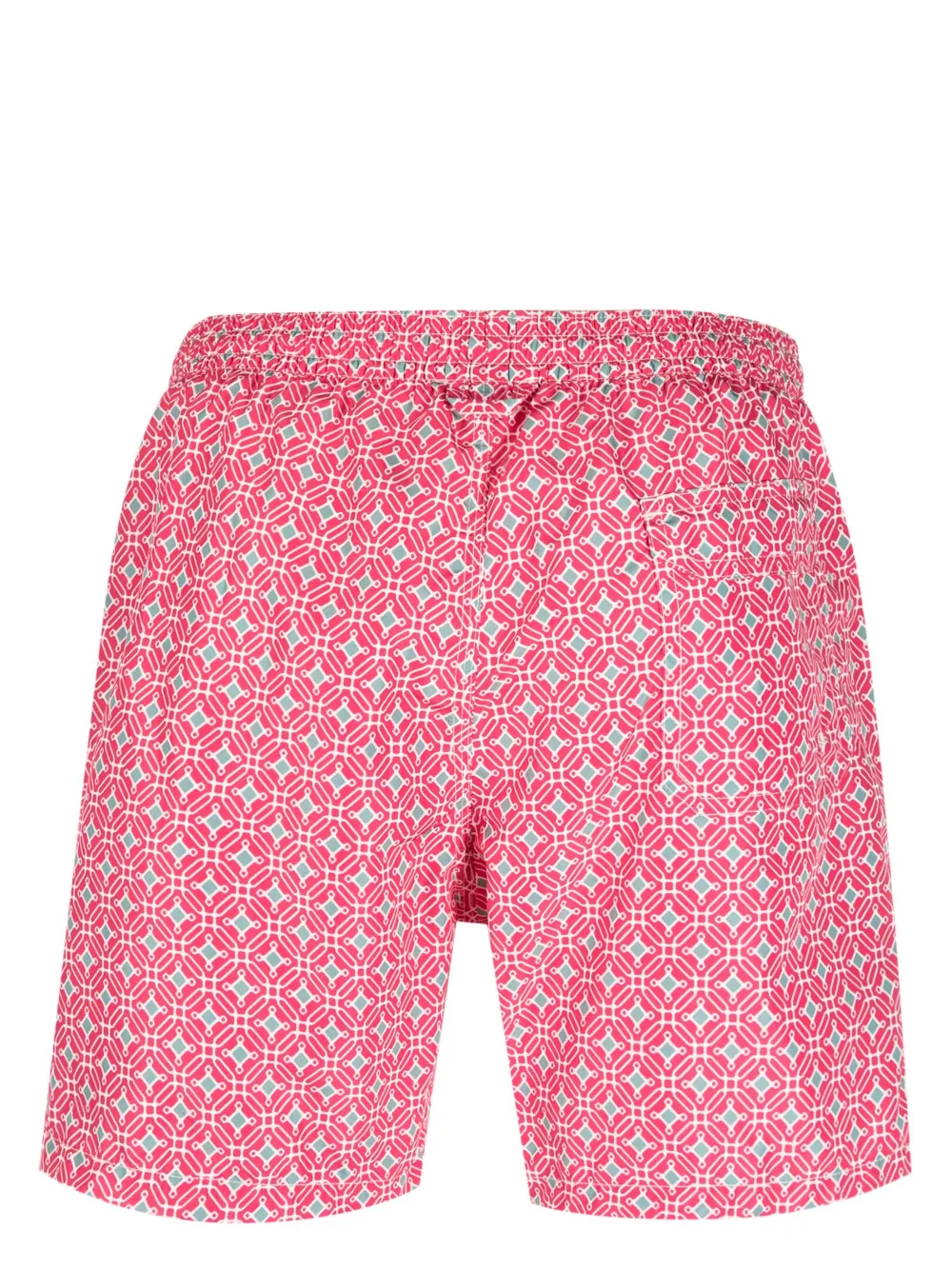 Geometrisch patroon, elastische tailleband met trekkoord, achterzak met klep en rechte zoom. Zwemkleding moet over je eigen kleding worden aangepast..