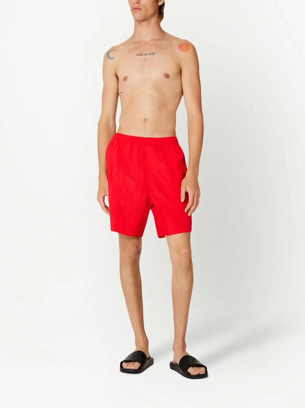 Rood, kenmerkende Ami de Coeur monogramprint, elastische tailleband, twee ingenaaide zijzakken, paspelzak aan de achterkant, rechte zoom en lengte tot boven de knie. Zwemkleding moet over je eigen kleding worden aangepast..