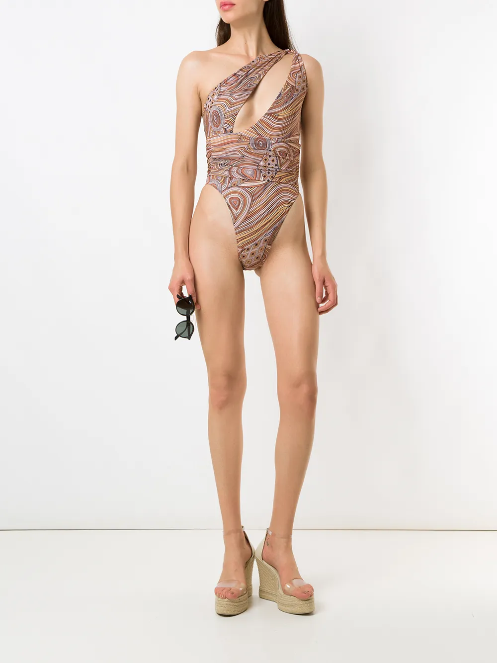 Asymmetrisch badpak van Amir Slama voorzien van one-shoulde design, gedrapeerd design, high-cut, een all-over print, voering en elastische bies. Dit artikel valt normaal qua maat. De print kan enigszins afwijken van het afgebeelde artikel. Zwemkleding moet over uw eigen kleding aan worden gepast.