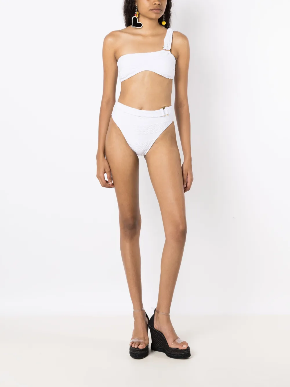 Optisch wit, stretch design, getextureerde afwerking, goudkleurig materiaal, asymmetrisch, striksluiting aan de achterkant en high waist bikinislip. Zwemkleding moet over je eigen kleding worden aangepast..