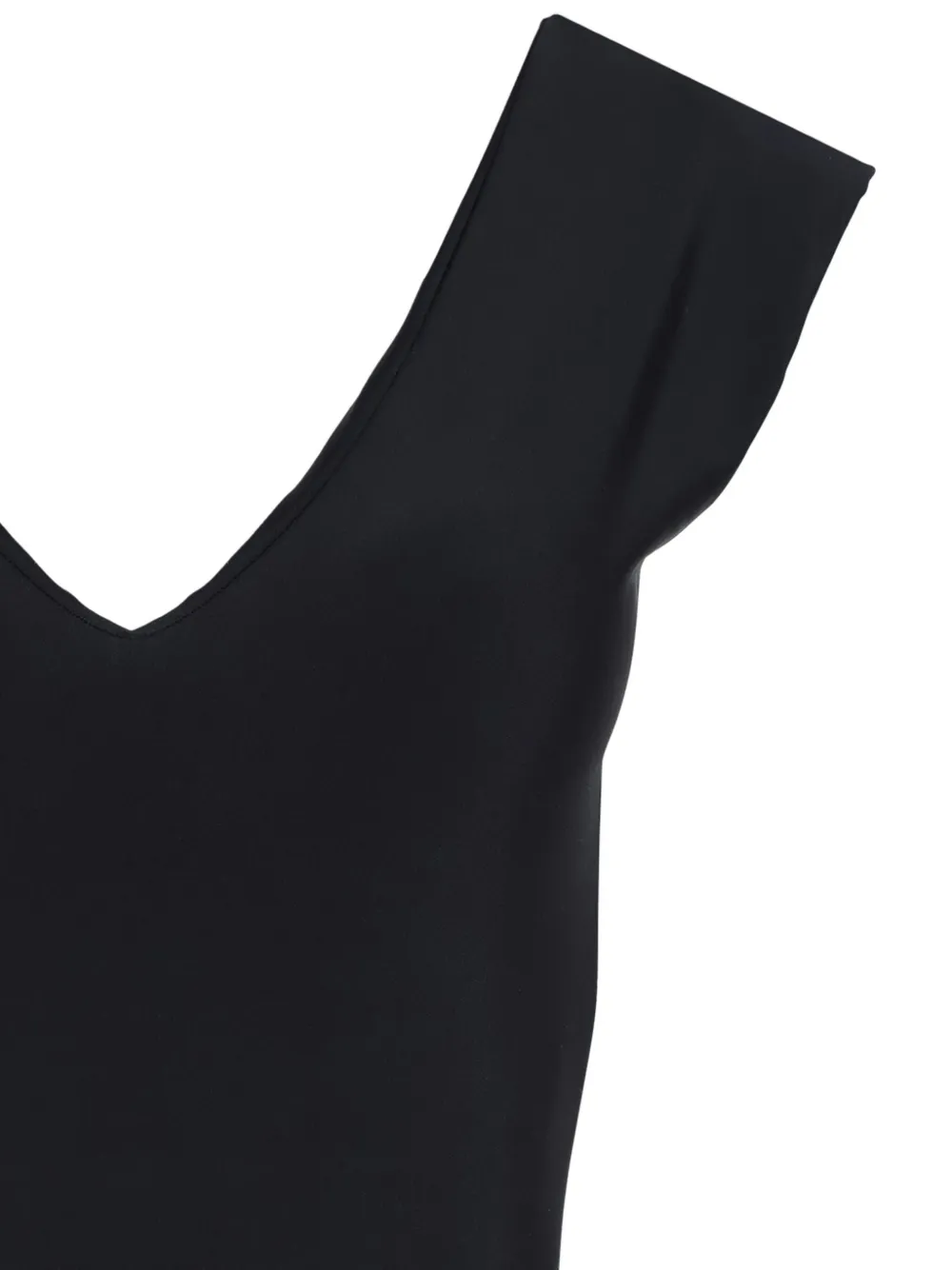 zwart stretch design gedraaide details instapmodel V-hals mouwloos gesmockte details open rug Zwemkleding moet over je eigen kleding worden aangepast.