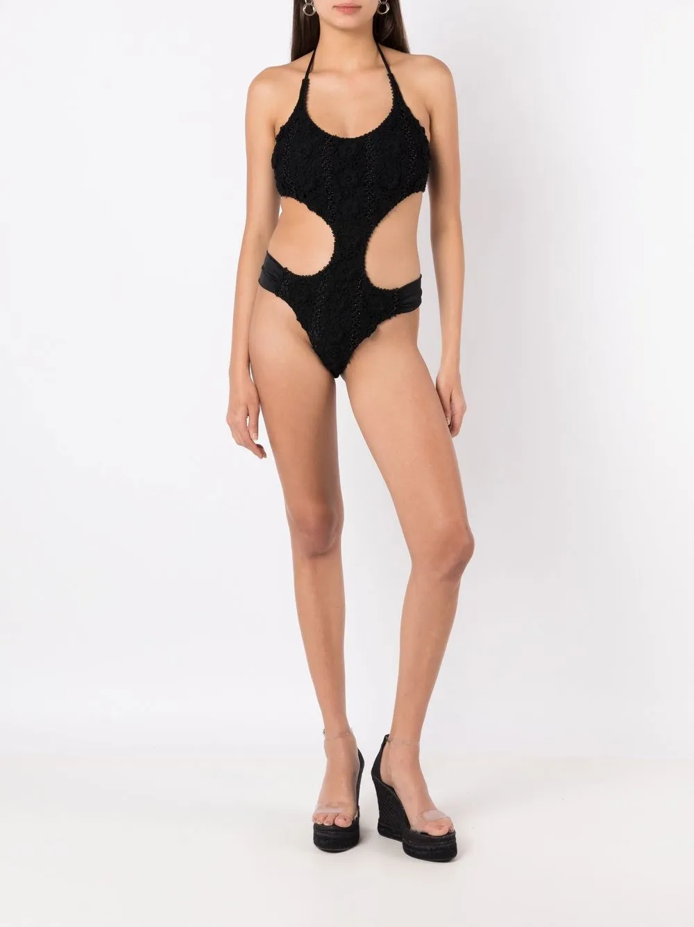 Zwart, stretch design, bloemenkant detail, uitgesneden detail , ronde hals, halternek striksluiting en low waist. Zwemkleding moet over je eigen kleding worden aangepast..