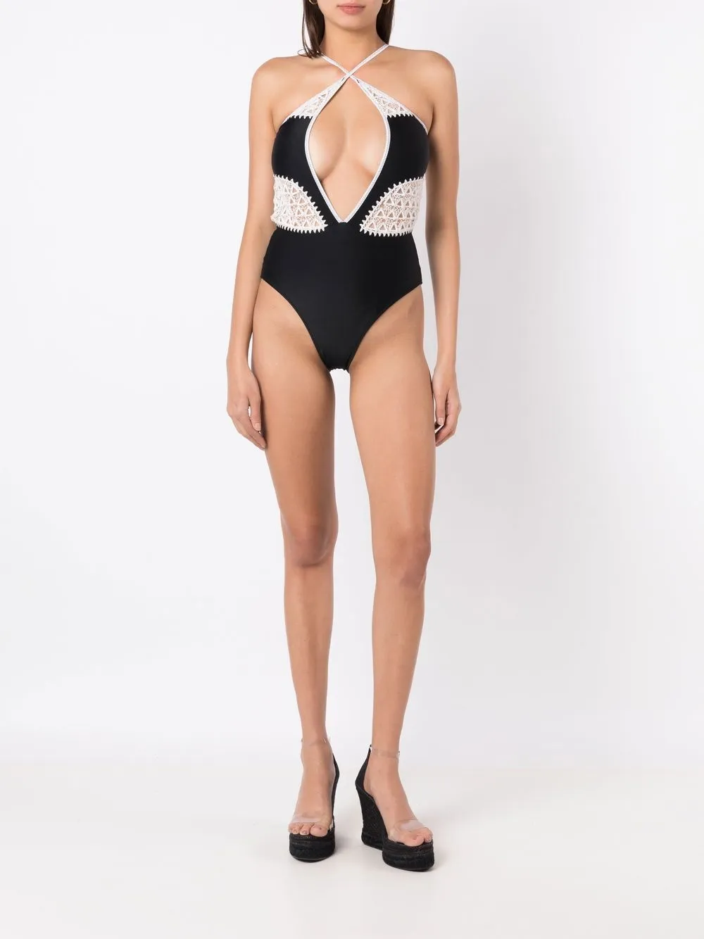 Zwart/wit, stretch design, kant detail, gekruiste band, V-vormige watervalhals en striksluiting. Zwemkleding moet over je eigen kleding worden aangepast..