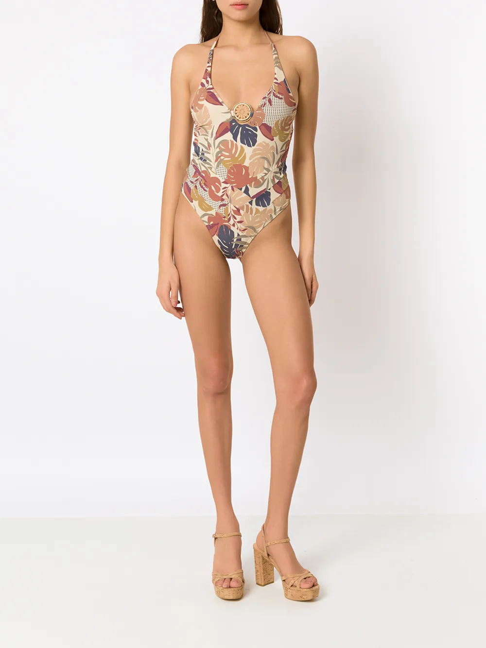 Halternek striksluiting, ring verfraaiing en striksluiting aan de achterkant. Zwemkleding moet over je eigen kleding worden aangepast.