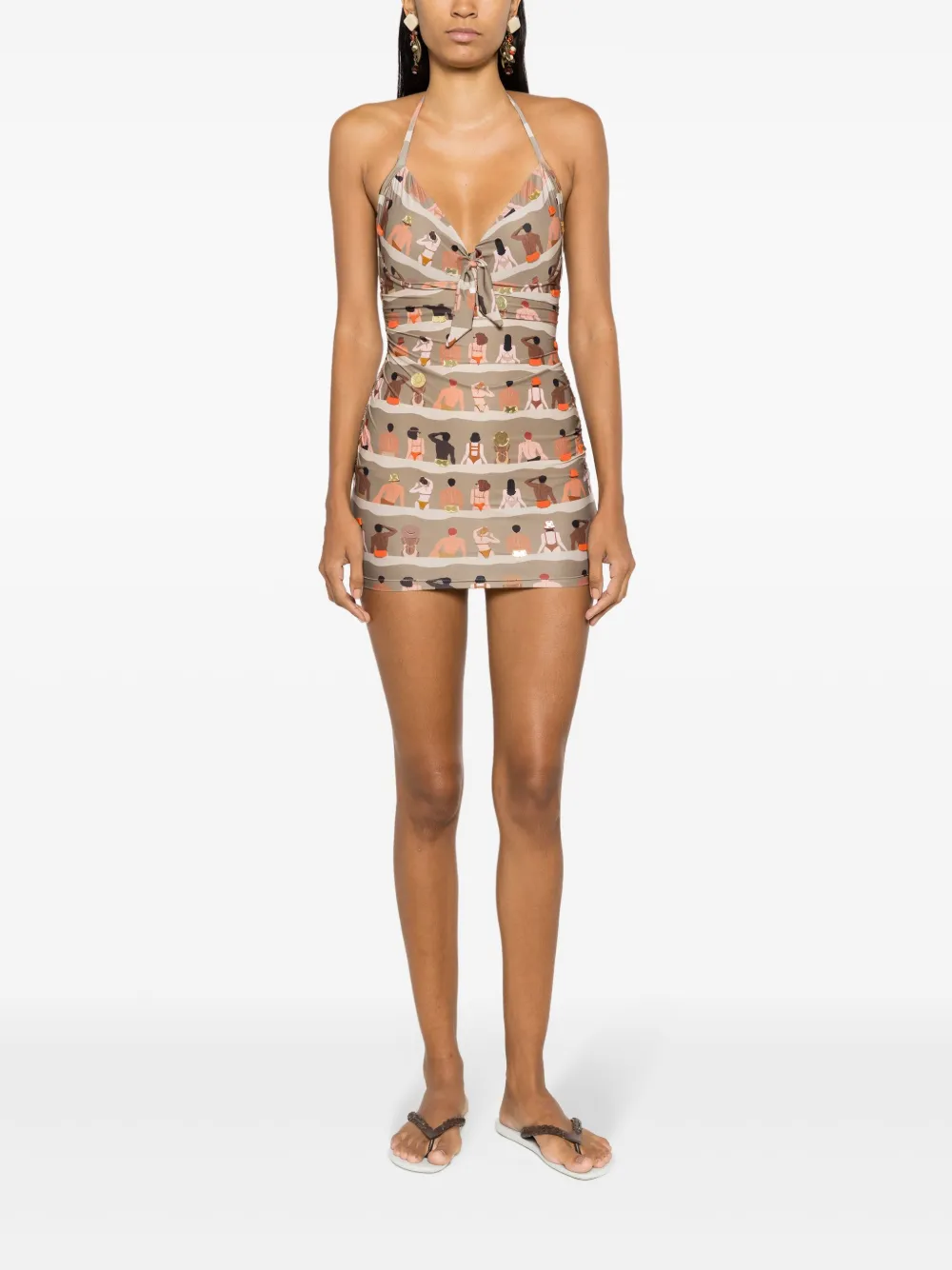 kaki/veelkleurig all-over grafische print stippenprint strikdetail ruchedetails stretch design halternek halternek striksluiting open rug dijlengte rechte zoom Zwemkleding moet over je eigen kleding worden aangepast.