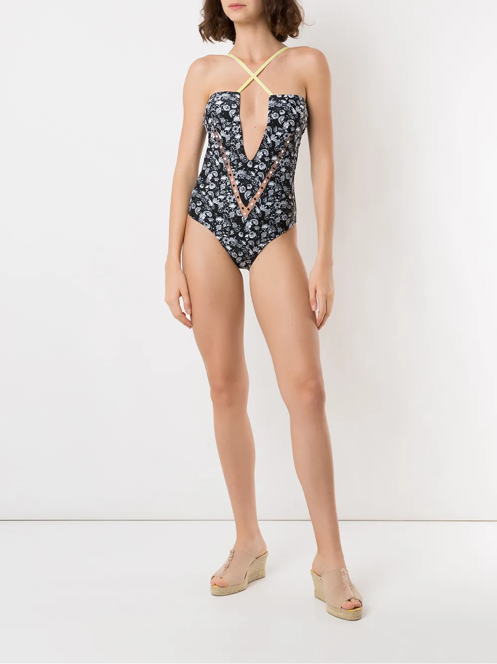 Badpak met print van Amir Slama voorzien van v-hals, gekruiste bandjes aan de voorkant, tulle inzetstukken, open achterzijde, een all-over print, elastische bies en voering. Dit artikel valt normaal qua maat. De print kan enigszins afwijken van het afgebeelde artikel. Zwemkleding moet over uw eigen kleding aan worden gepast.