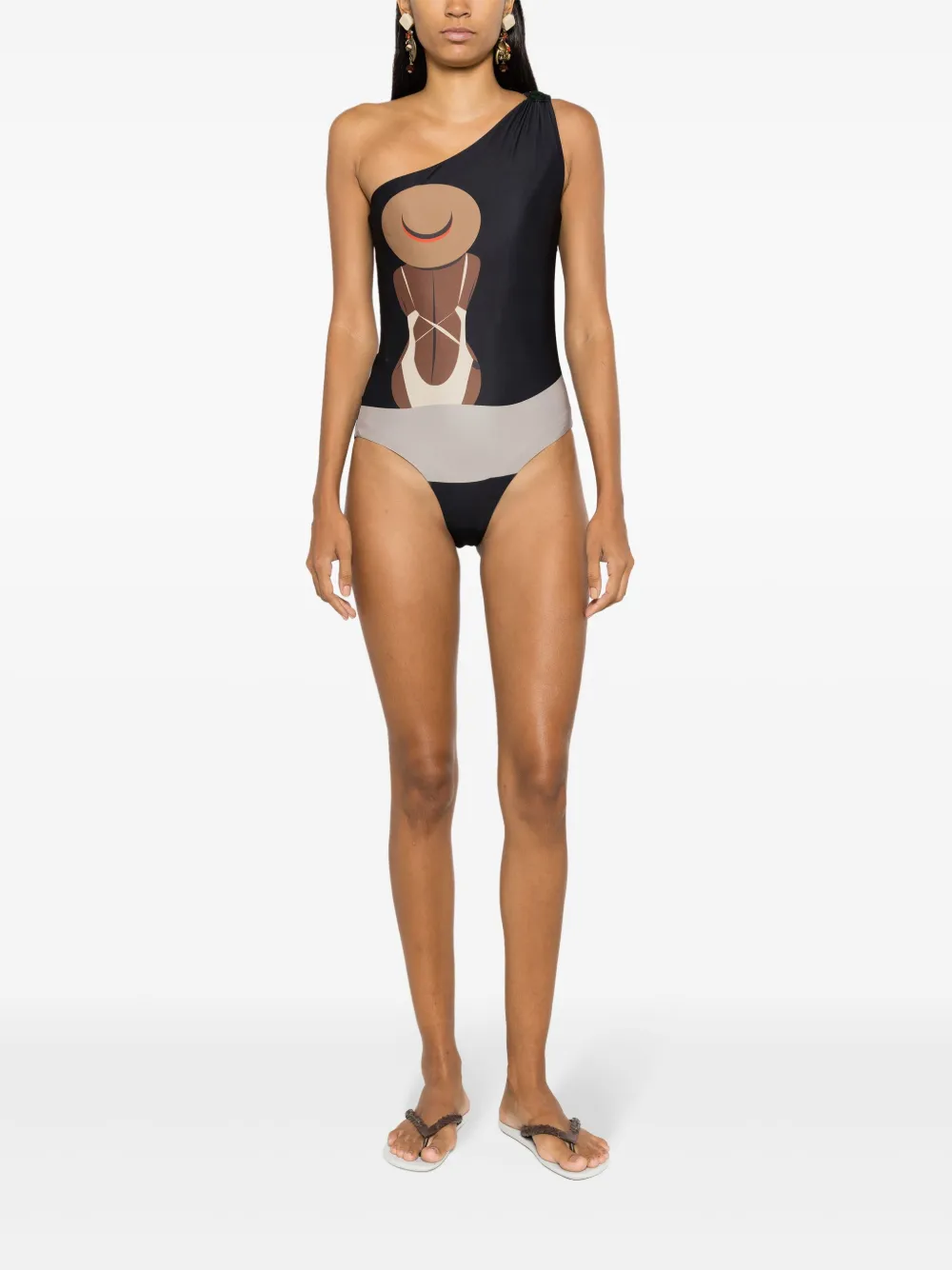 zwart/veelkleurig all-over grafische print stretch design asymmetrische schouder instapmodel Zwemkleding moet over je eigen kleding worden aangepast.