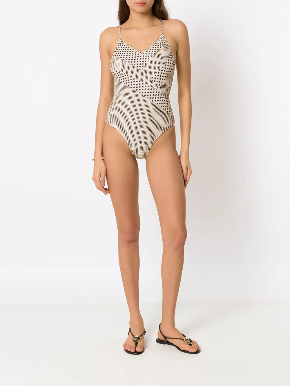 Stippenprint, design met vlakken, V-hals, spaghettibandjes en gekruiste bandjes aan de achterzijde. Zwemkleding moet over uw eigen kleding worden aangepast. Doe dit niet als u eenmaal het water in springt.