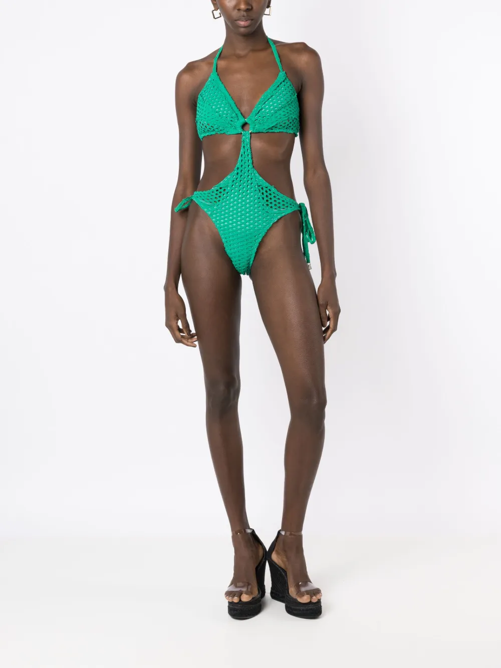 Jadegroen, getextureerde afwerking, uitgesneden detail, triangel cup, halternek striksluiting, striksluiting aan de achterkant, bikinislip met striksluiting aan de zijkant en high waist. Zwemkleding moet over je eigen kleding worden aangepast..
