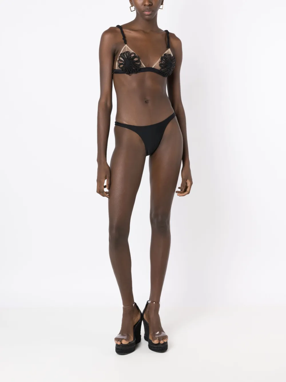 Zwart, blush roze, bloemenpatch, V-hals, rechte open rug, verstelbare spaghettibandjes en mid waist. Zwemkleding moet over je eigen kleding worden aangepast..