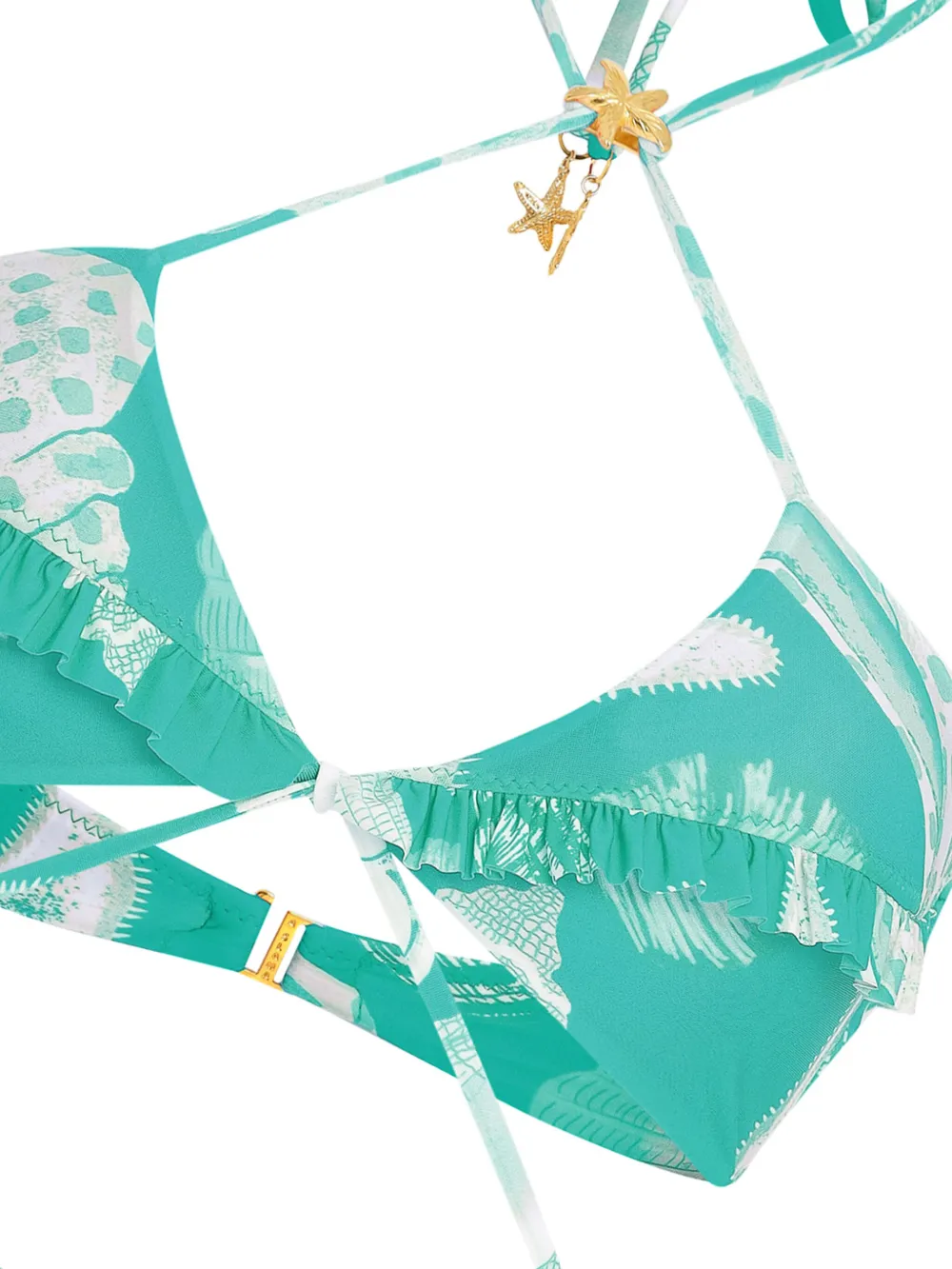 turkoois blauwgroen haaksluiting aan de achterkant gestrikte bandjes gekruiste band Zwemkleding moet over je eigen kleding worden aangepast.