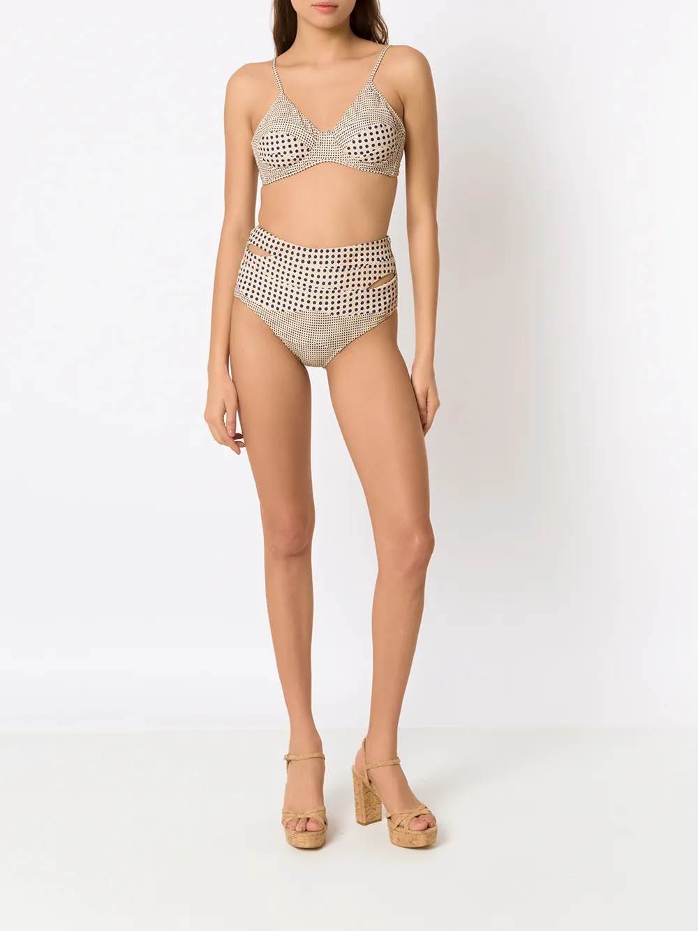 Stippenprint, V-hals, verstelbare spaghettibandjes , striksluiting aan de achterkant, high waist broekje en uitgesneden detail . Zwemkleding moet over uw eigen kleding worden aangepast. Doe dit niet als u eenmaal het water in springt.