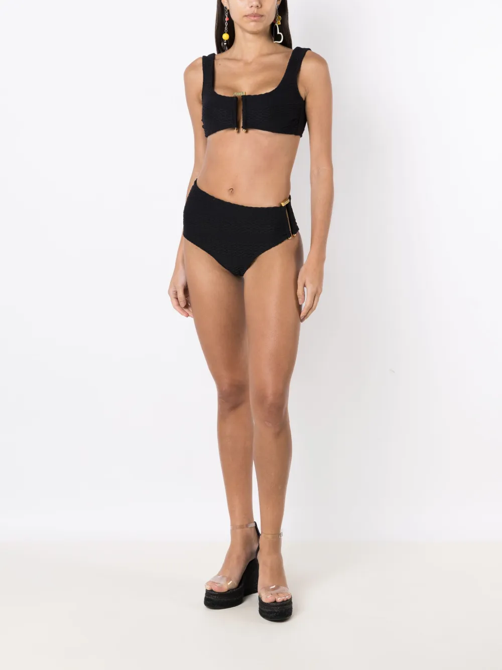 Zwart, stretch design, getextureerde afwerking, goudkleurig materiaal, vierkante hals, brede schouderbandjes, striksluiting aan de achterkant, asymmetrisch design en mid waist. Zwemkleding moet over je eigen kleding worden aangepast..