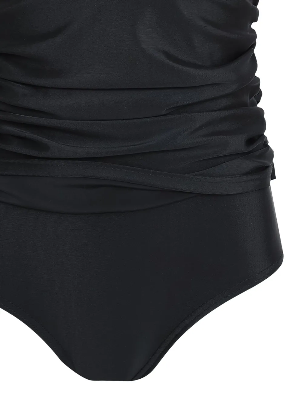 zwart stretch design gedrapeerd design halternek V-vormige watervalhals open rug Zwemkleding moet over je eigen kleding worden aangepast.