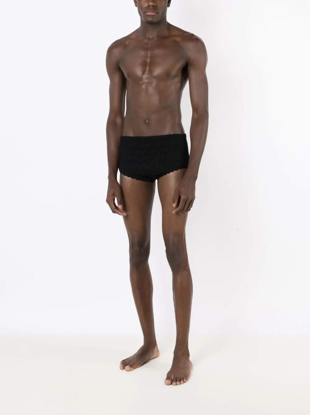 Gitzwart, stretch design, discrete stiksels, gehaakt en elastische tailleband. Zwemkleding moet over je eigen kleding worden aangepast..