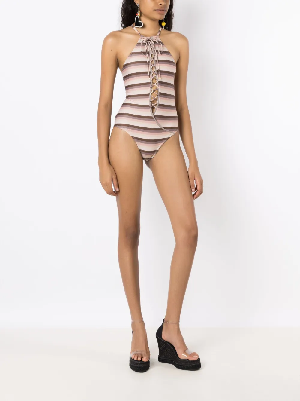 Veelkleurig, stretch design, gestreepte print, uitgesneden detail , multifunctionele bandjes, halternek, vetersluiting aan de voorkant en mouwloos. Zwemkleding moet over je eigen kleding worden aangepast..