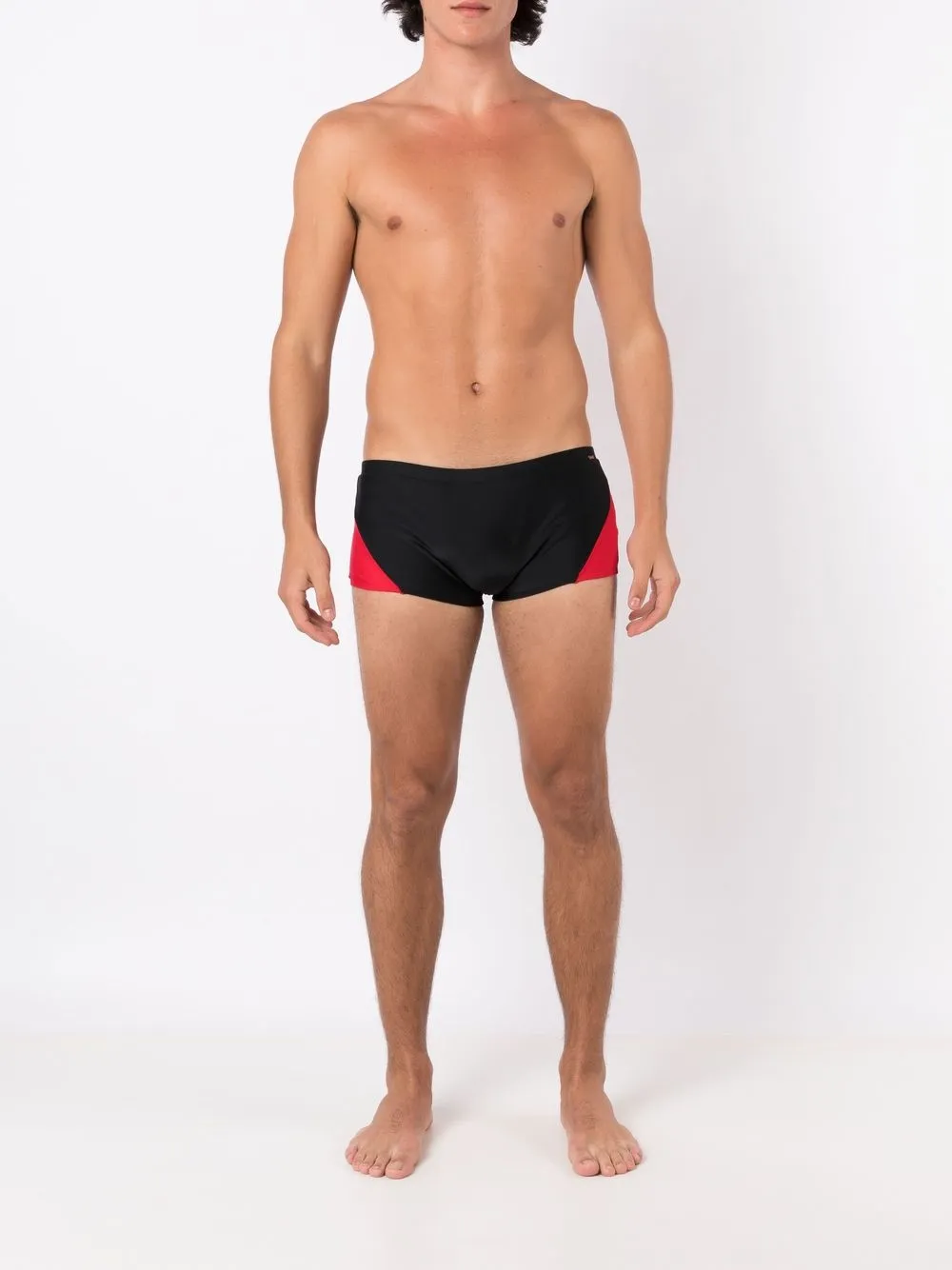 Zwart/rood, tweekleurig design, slip-on stijl en dijlengte. Zwemkleding moet over je eigen kleding worden aangepast..