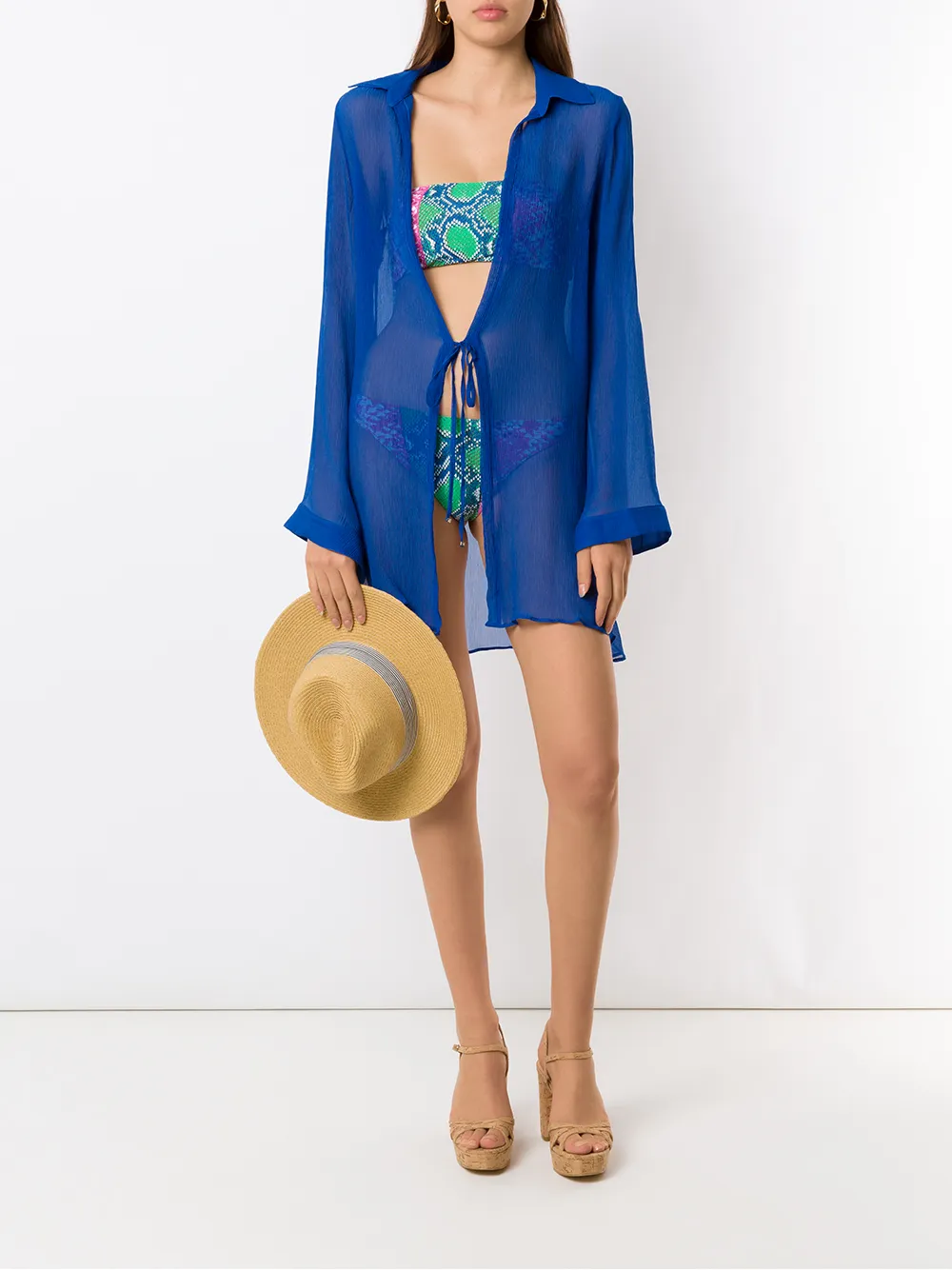 Striksluiting aan de voorzijde, klassieke kraag en lange mouwen. Materiaal: zijde. Zwemkleding moet over uw eigen kleding worden aangepast. Doe dit niet als u eenmaal het water in springt.