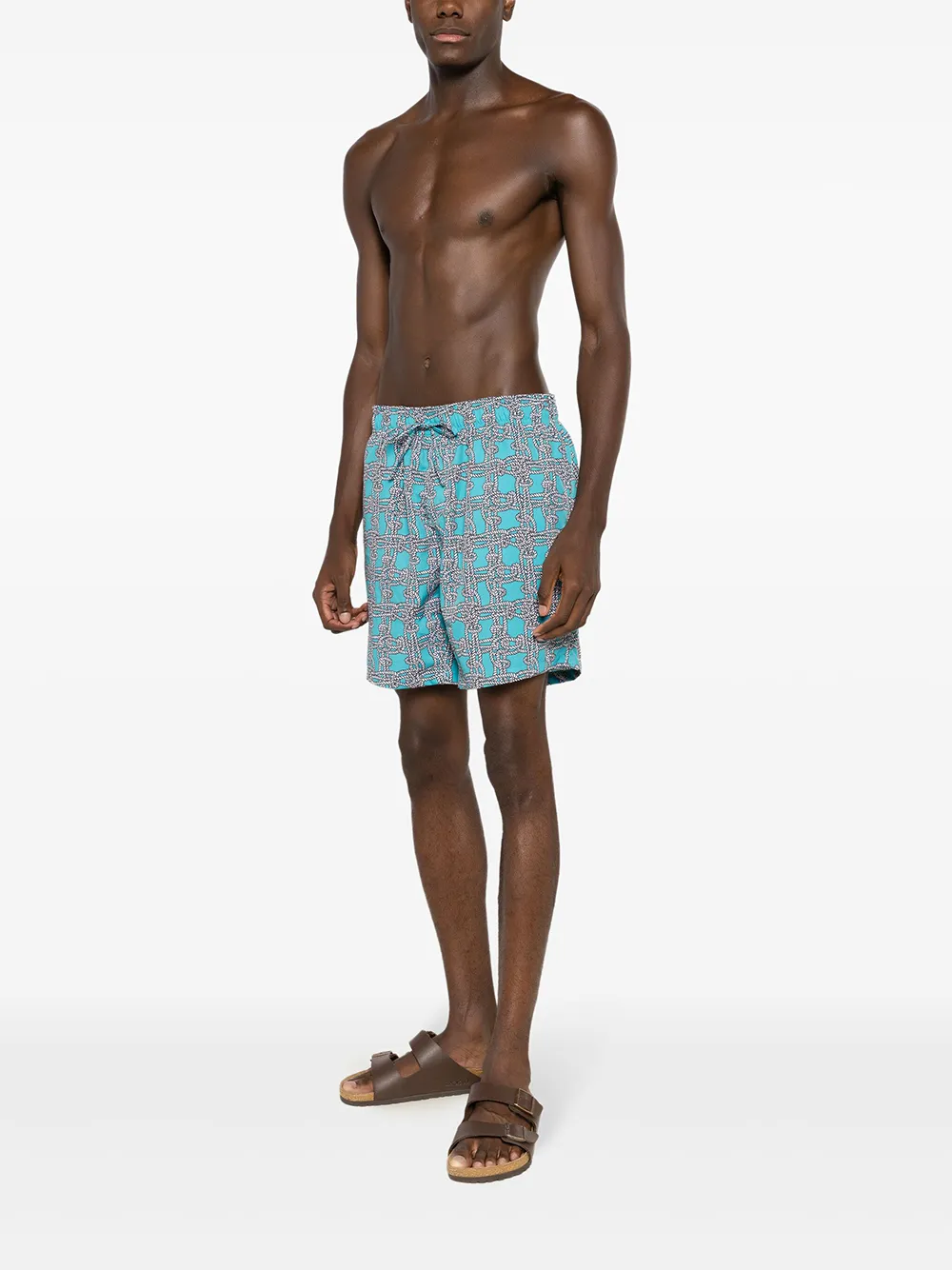 aqua blauw stretch design all-over grafische print elastische tailleband met trekkoord twee steekzakken aan de zijkant klepzak aan de achterzijde lengte tot boven de knie Zwemkleding moet over je eigen kleding worden aangepast.