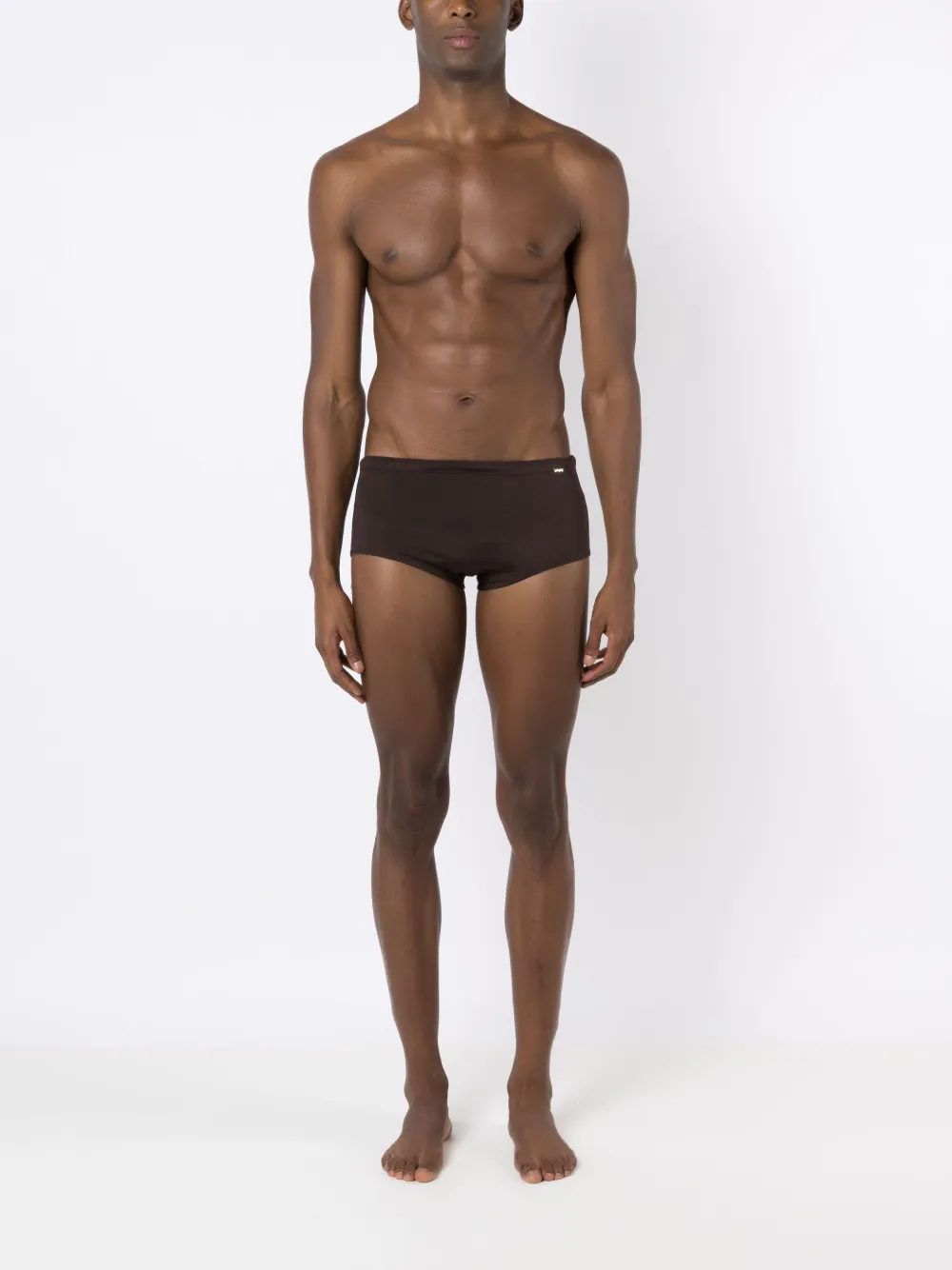 Koffiebruin, stretch design, logo plakkaat en low waist. Zwemkleding moet over je eigen kleding worden aangepast..