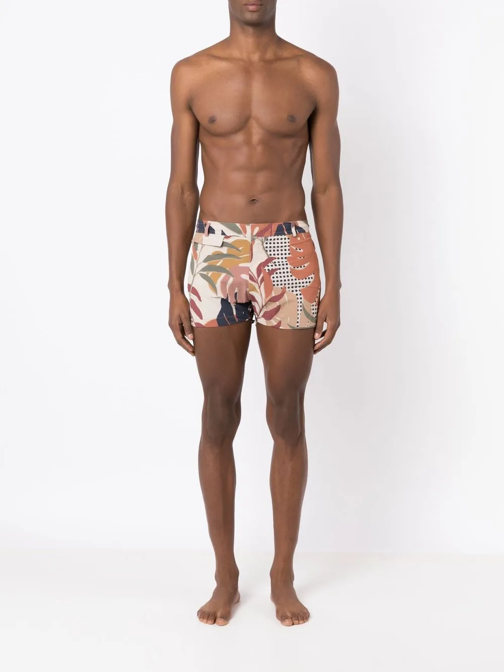 Bruin, bladerenprint, klittenbandsluiting aan de voorzijde, elastische tailleband, zij klepzakken, achterzak met klep en lengte tot boven de knie. Zwemkleding moet over je eigen kleding worden aangepast..