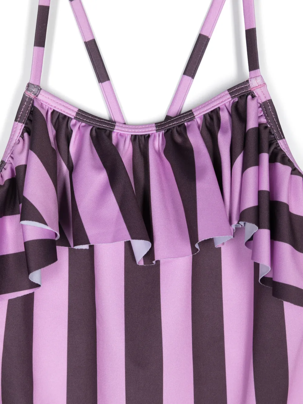 donkerroze/koffiebruin gerecyclede polyesterblend verticale strepenprint ruches details vierkante hals gekruiste schouderbandjes lage rug Zwemkleding moet over je eigen kleding worden aangepast. ^