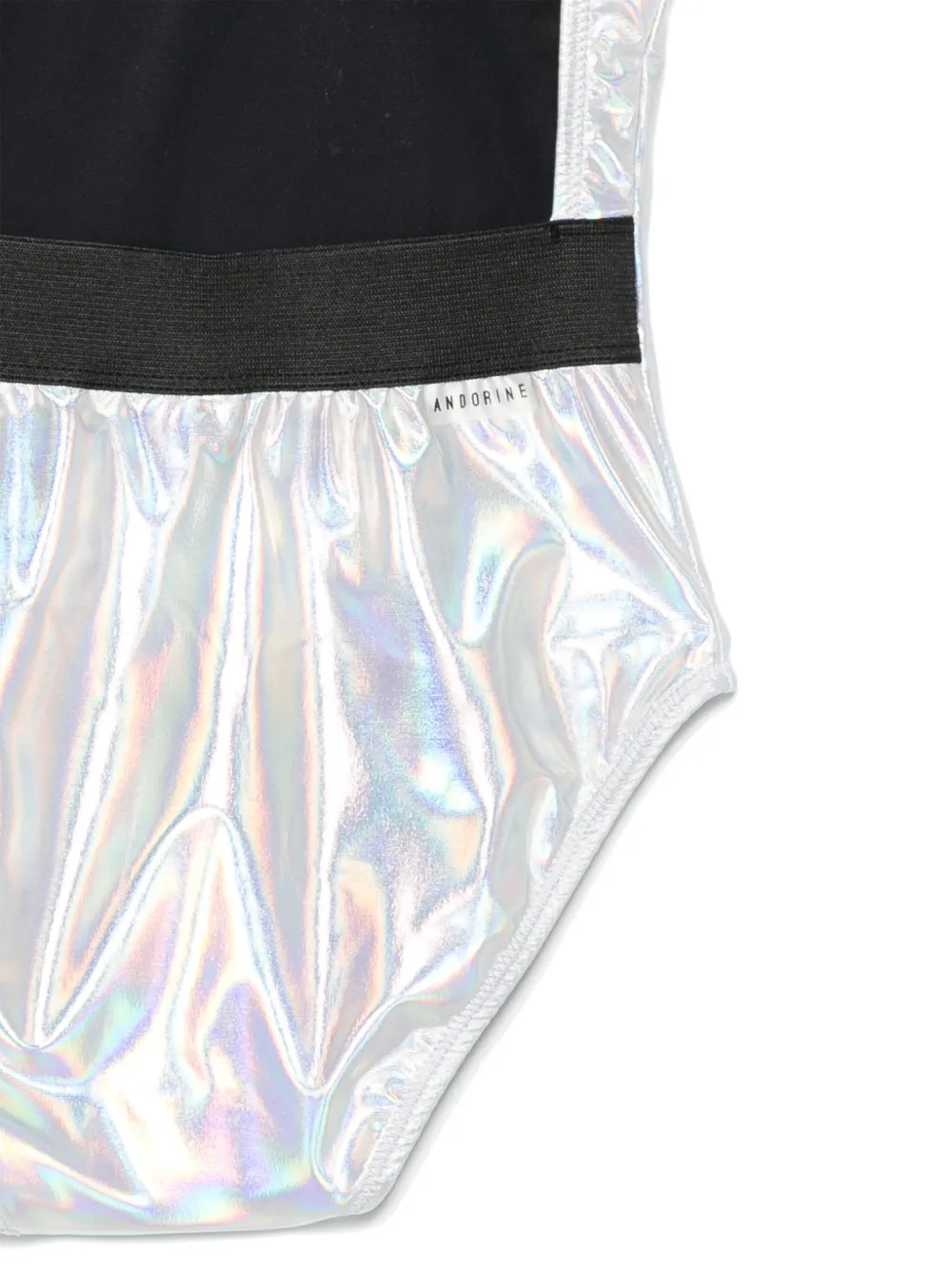 zilverkleurig striksluiting aan de achterkant diepe ronde hals mouwloos Zwemkleding moet over je eigen kleding worden aangepast.