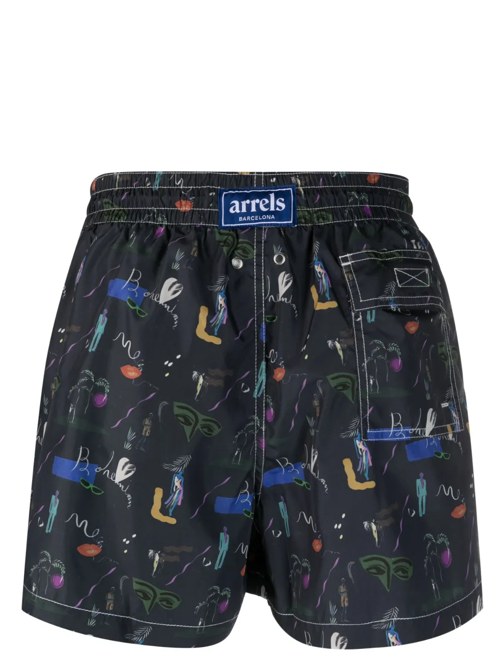Marineblauw, veelkleurig, all-over grafische print, contrasterende stiksels, logopatch aan de achterkant, dijlengte, elastische tailleband met trekkoord, twee steekzijzakken en achterzak met klep. Zwemkleding moet over je eigen kleding worden aangepast.. . .