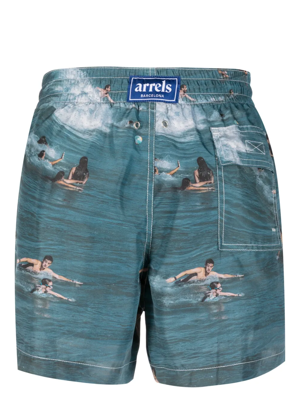 Lichtblauw, veelkleurig, all-over grafische print, contrasterende stiksels, logopatch aan de achterkant, dijlengte, elastische tailleband met trekkoord, twee steekzijzakken en achterzak met klep. Zwemkleding moet over je eigen kleding worden aangepast.. . .