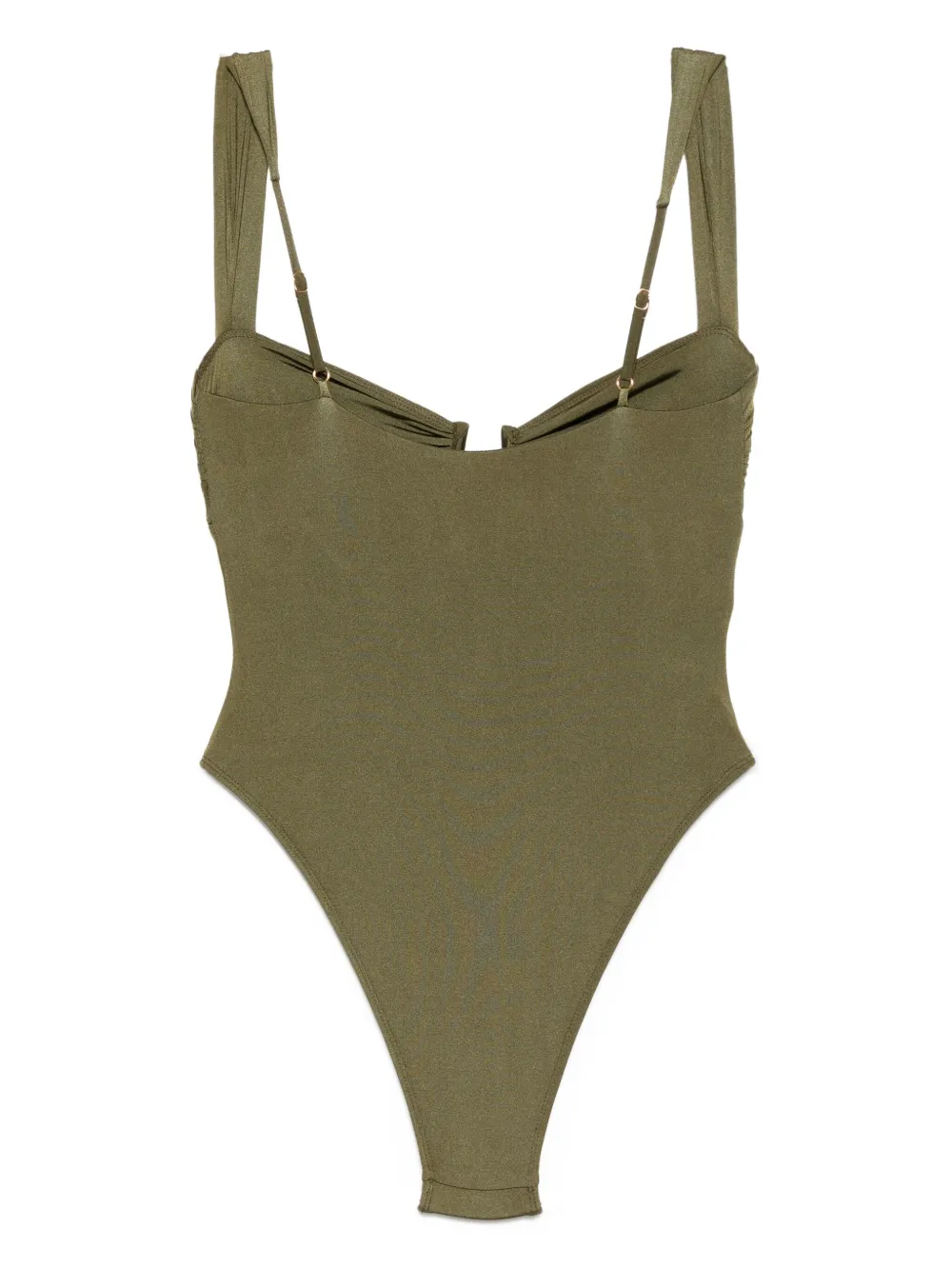 olijfgroen verstelbare schouderband hoog uitgesneden gesmockte details Zwemkleding moet over je eigen kleding worden aangepast.
