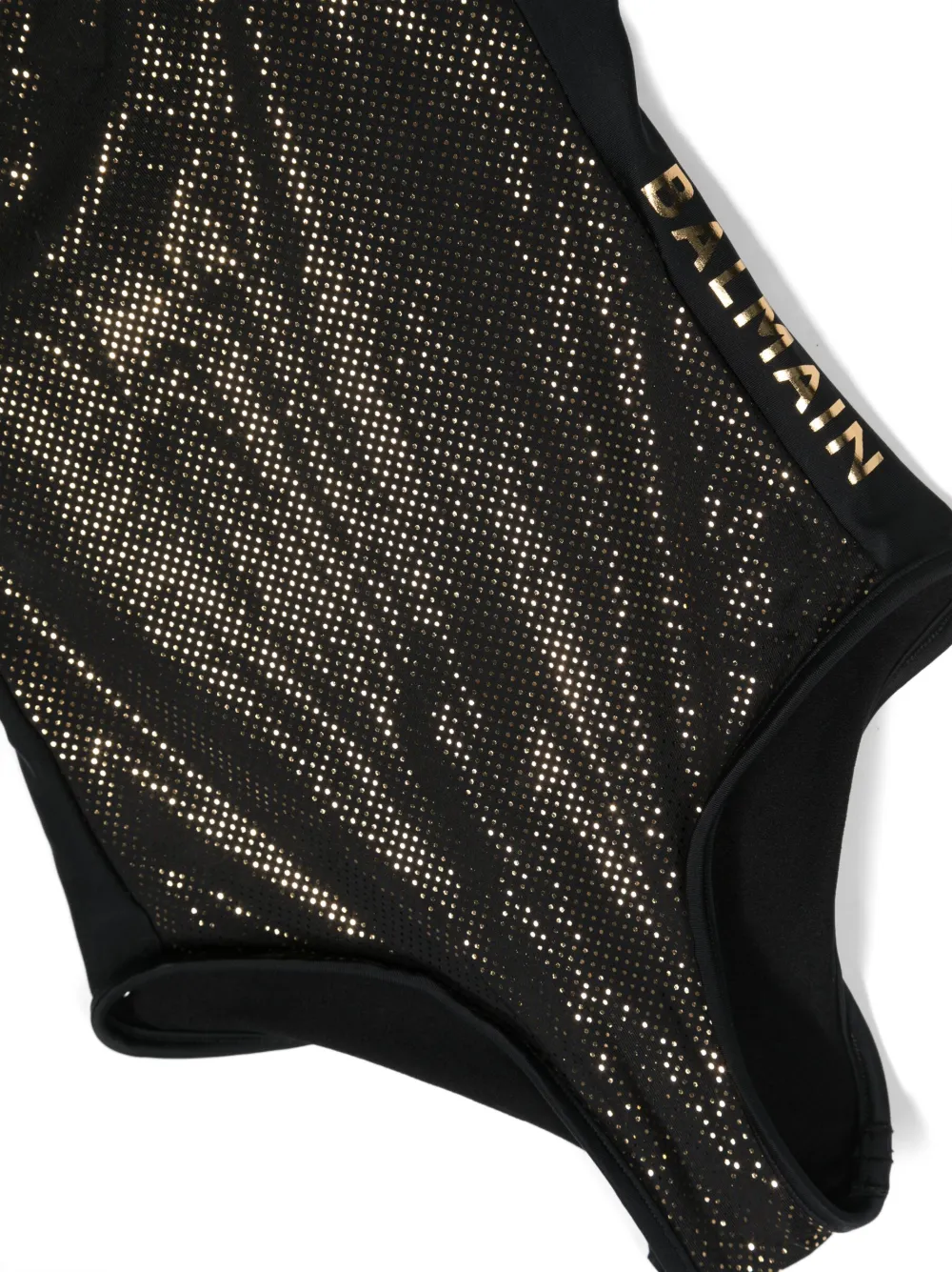 Zwart, goudkleurig, stretch design, design met colourblocking, logoprint aan de zijkant, vierkante hals en dunne schouderbandjes. Zwemkleding moet over je eigen kleding worden aangepast..
