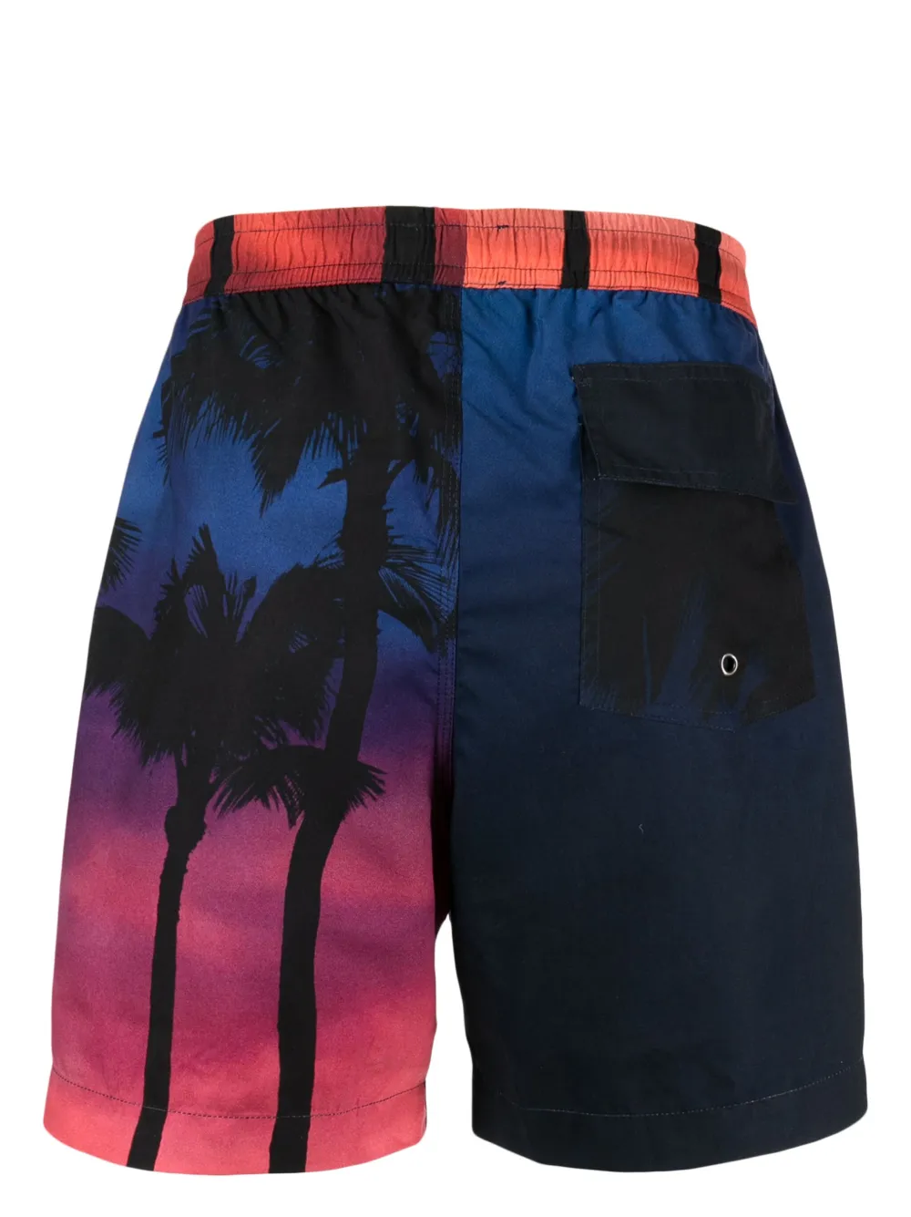 Marineblauw, veelkleurig, palmboomprint, elastische tailleband met trekkoord en achterzak met klep. Zwemkleding moet over je eigen kleding worden aangepast..