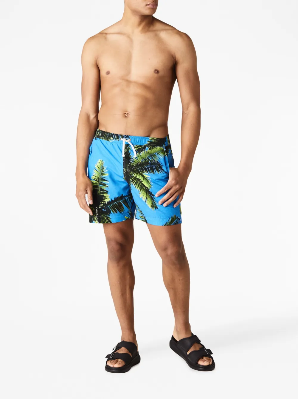 Hemelsblauw, veelkleurig, palmboomprint, elastische tailleband met trekkoord, twee steekzijzakken en opgestikte achterzak. Zwemkleding moet over je eigen kleding worden aangepast..