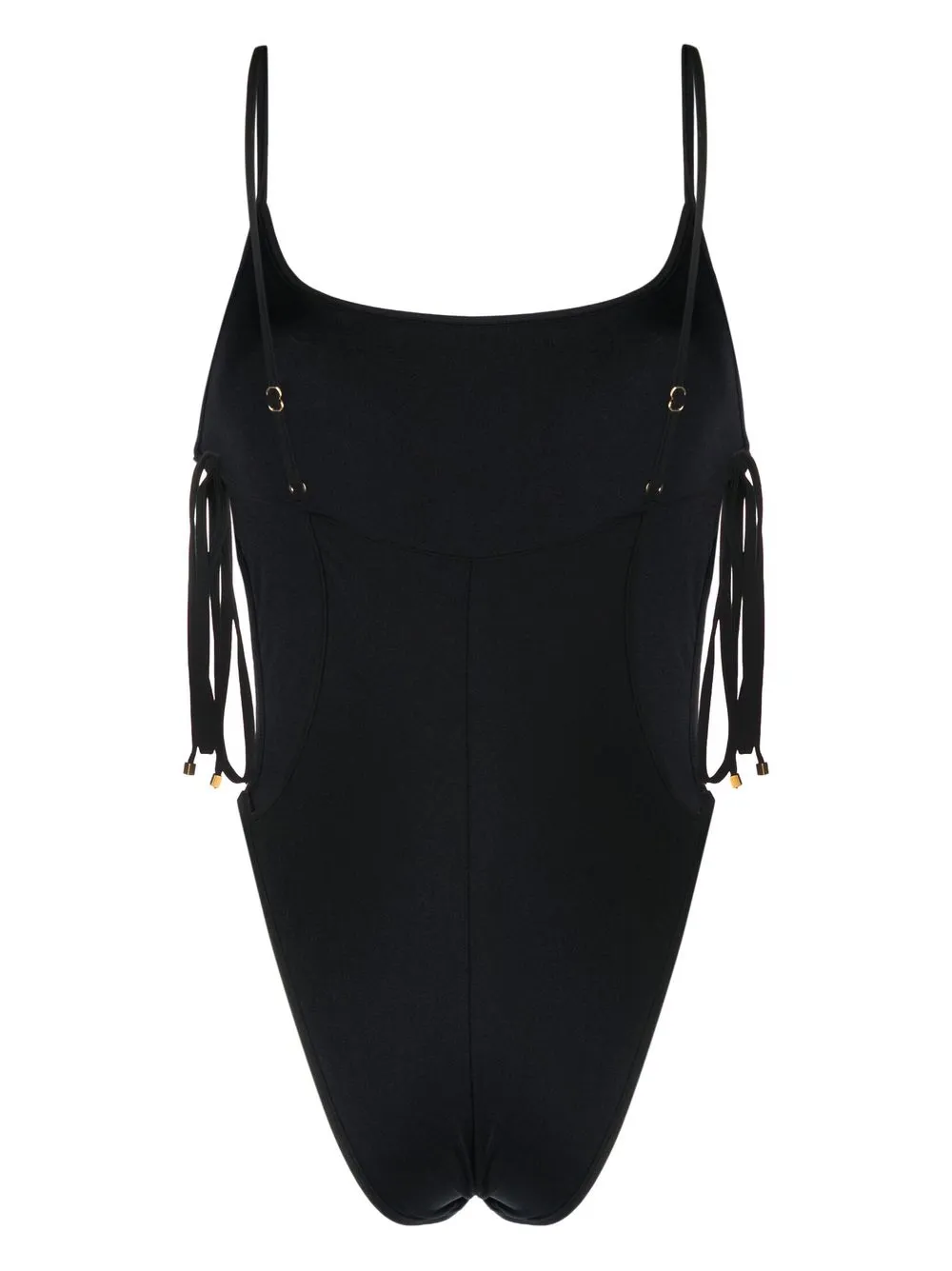 Zwart, stretch design, uitgesneden detail , striksluiting aan de zijkant, ronde hals en dunne schouderbandjes. Zwemkleding moet over je eigen kleding worden aangepast..