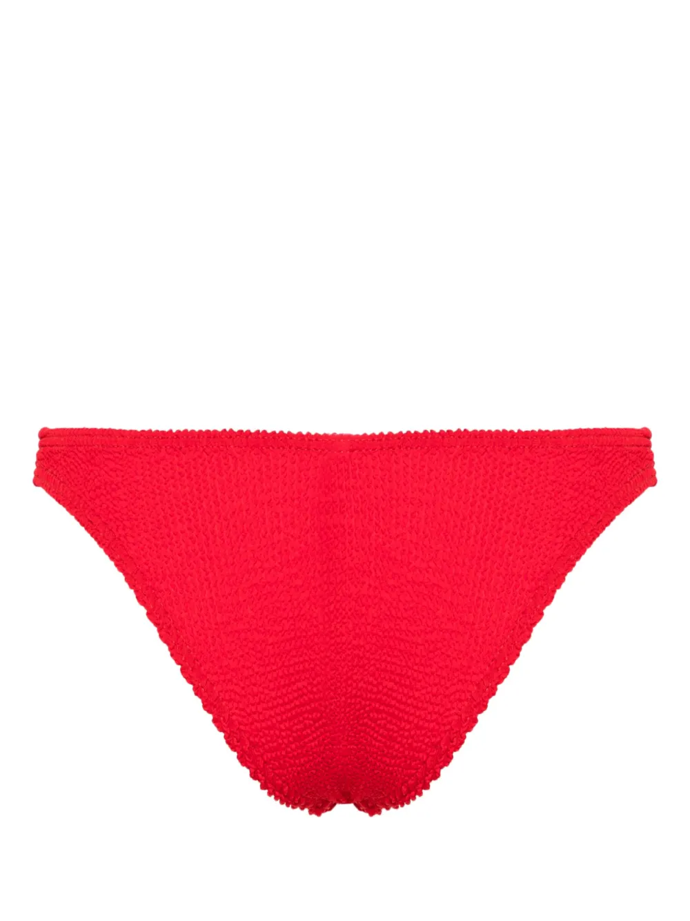 helderrood gerecyclede polyamideblend seersucker textuur gekreukte afwerking high waist elastische band hoog uitgesneden Zwemkleding moet over je eigen kleding worden aangepast.