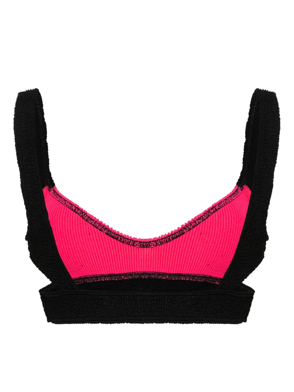 ^zwart/framboosroze gerecyclede nylonmix gesmockt vlak design met colourblocking diepe ronde hals uitgesneden detail rechte open rug ongevoerd Zwemkleding moet over je eigen kleding worden aangepast.