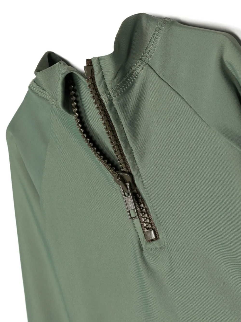 Saliegroen, stretch design, logoprint op de voorkant, rits aan de achterkant , lange mouwen en rechte zoom. Zwemkleding moet over je eigen kleding worden aangepast..
