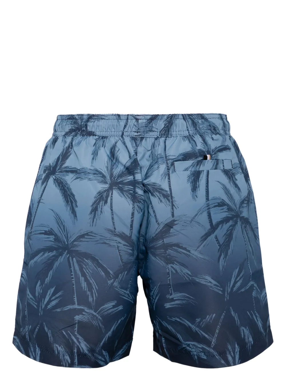 marineblauw gerecycled polyester palmboomprint elastische tailleband met trekkoord twee steekzakken aan de zijkant paspelzak aan de achterkant lengte tot boven de knie Zwemkleding moet over je eigen kleding worden aangepast.