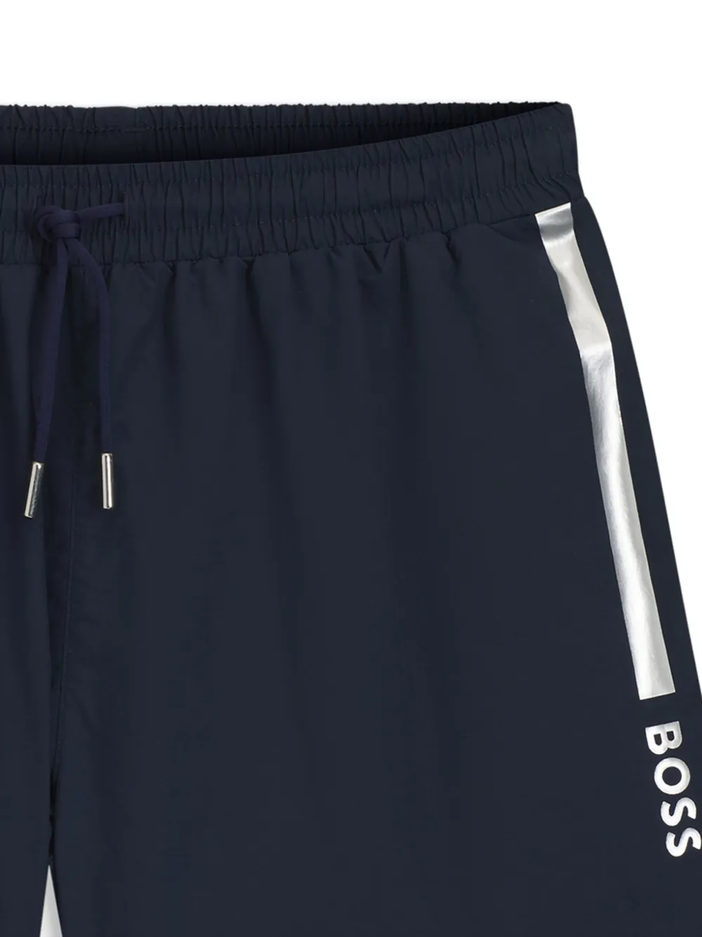 marineblauw trekkoordsluiting zijstreep logo elastische tailleband Zwemkleding moet over je eigen kleding worden aangepast.