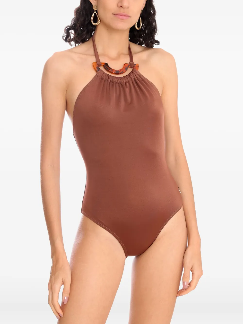bruin halternek ringdetail gesmockte hals open rug Zwemkleding moet over je eigen kleding worden aangepast.