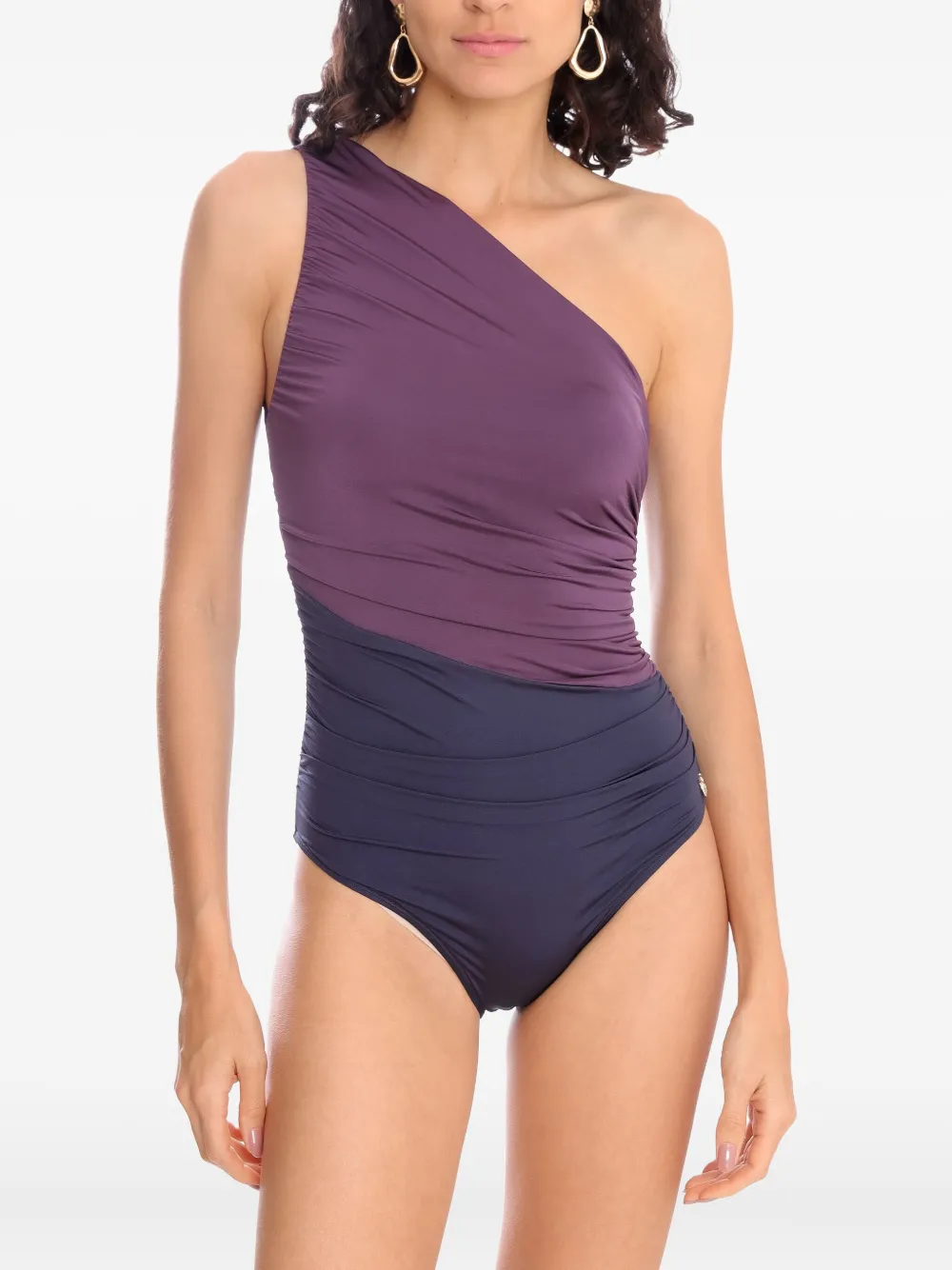 paars asymmetrisch design gedrapeerd detail ruchedetails Zwemkleding moet over je eigen kleding worden aangepast.
