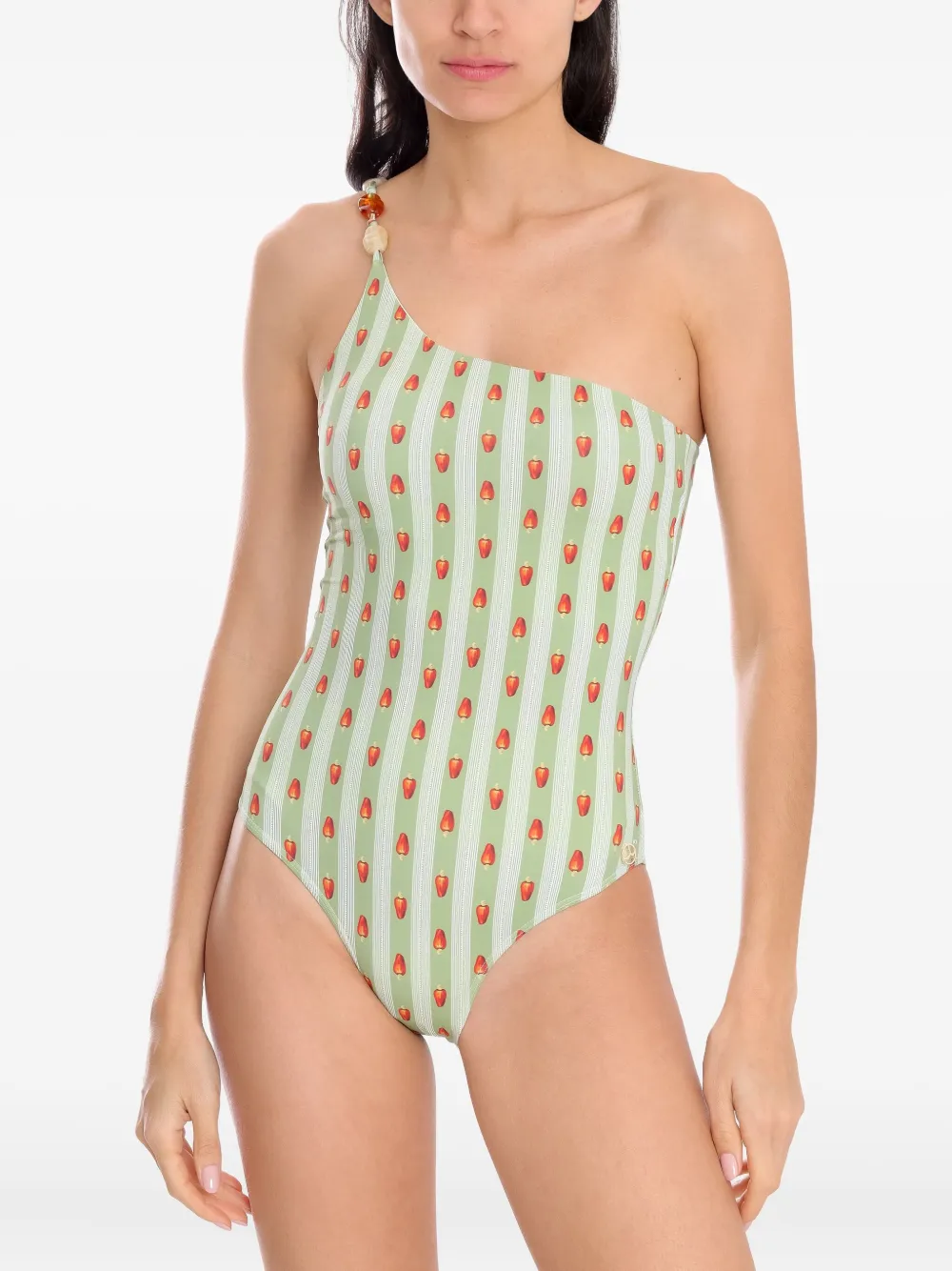 groen verticale strepen aardbeiprint asymmetrisch design Zwemkleding moet over je eigen kleding worden aangepast.