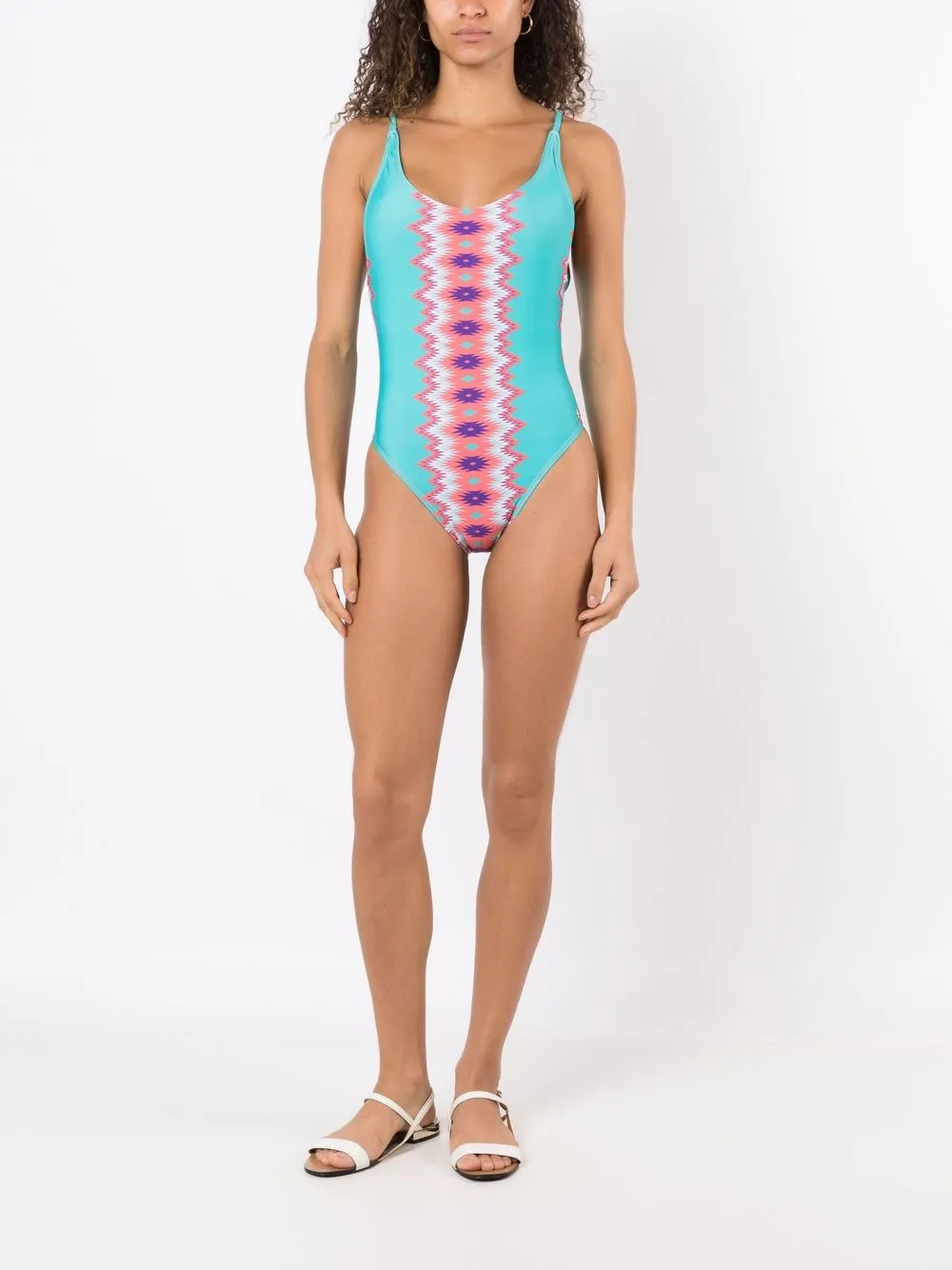 Aqua blauw, violetpaars, perzikroze, stretch design, geometrisch patroon, verstelbare spaghettibandjes, laag uitgesneden rug en medium dekking. Zwemkleding moet over je eigen kleding worden aangepast..