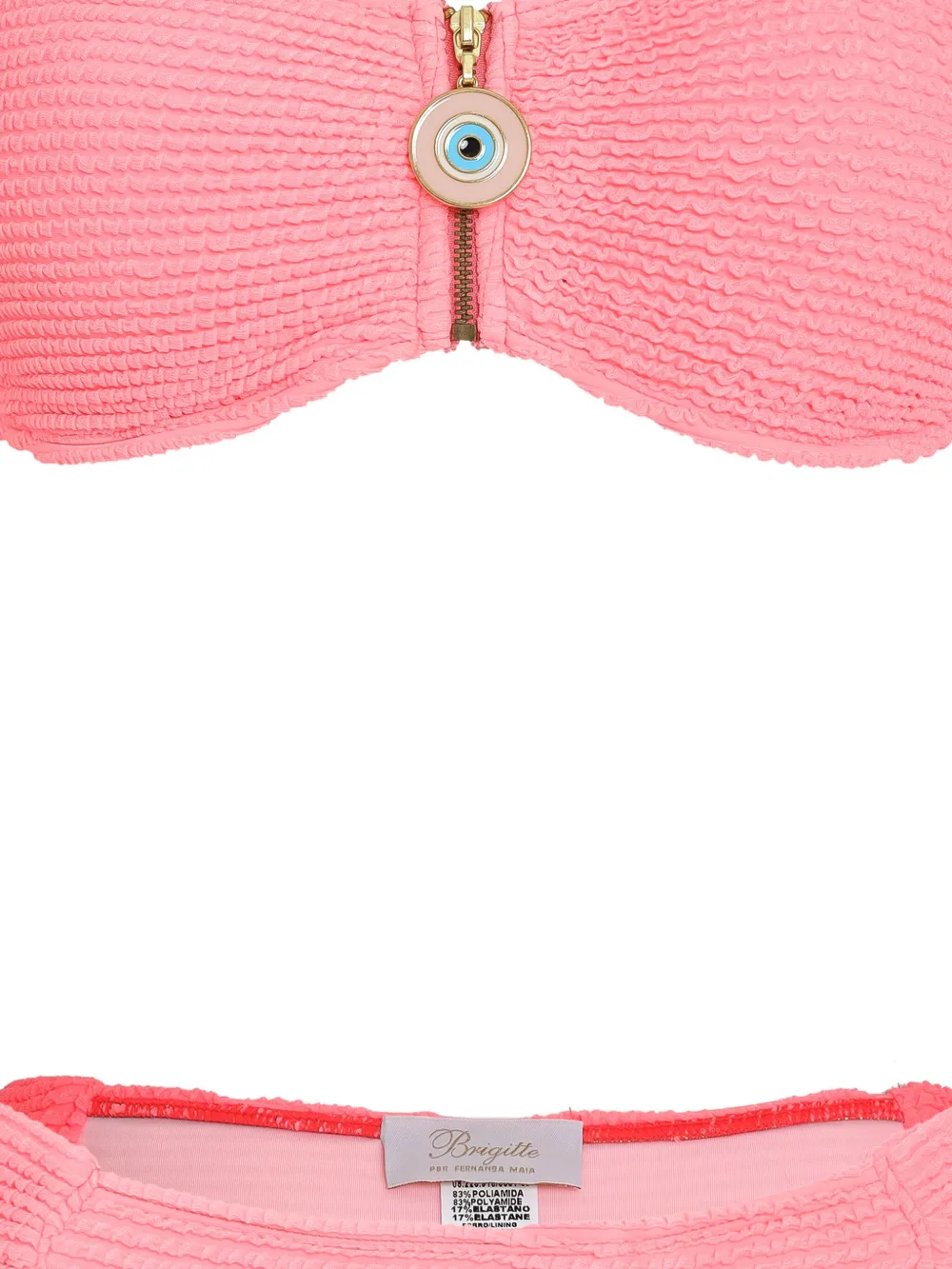 roze stretch design Bikinitop: bandeau ritssluiting aan de voorkant haaksluiting aan de achterkant Bikinibroek: low waist Zwemkleding moet over je eigen kleding worden aangepast.