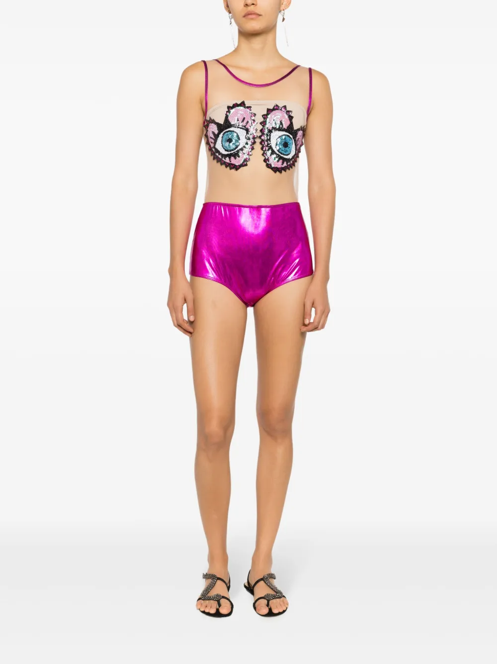 roze stretch design mesh detail semi-doorzichtige uitvoering contrasterende afwerking pailletten versiering diepe ronde hals laag uitgesneden rug mouwloos volledige dekking Zwemkleding moet over je eigen kleding worden aangepast.