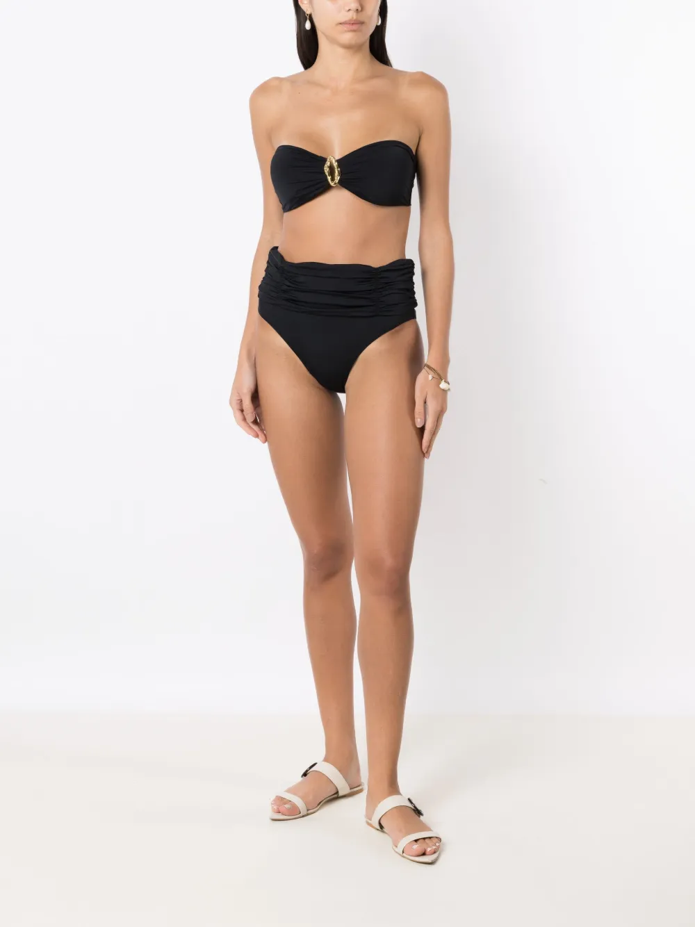 Stretch design, goudkleurig materiaal, ruchedetails, strapless , striksluiting aan de achterkant en high waist bikinislip. Zwemkleding moet over je eigen kleding worden aangepast..